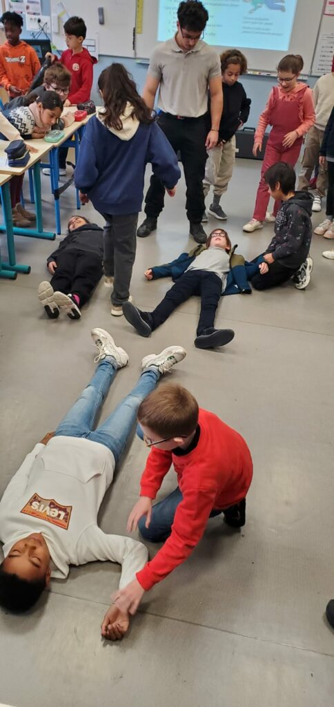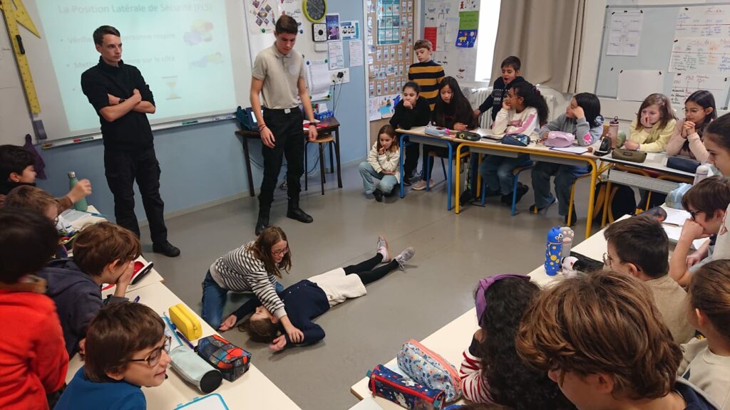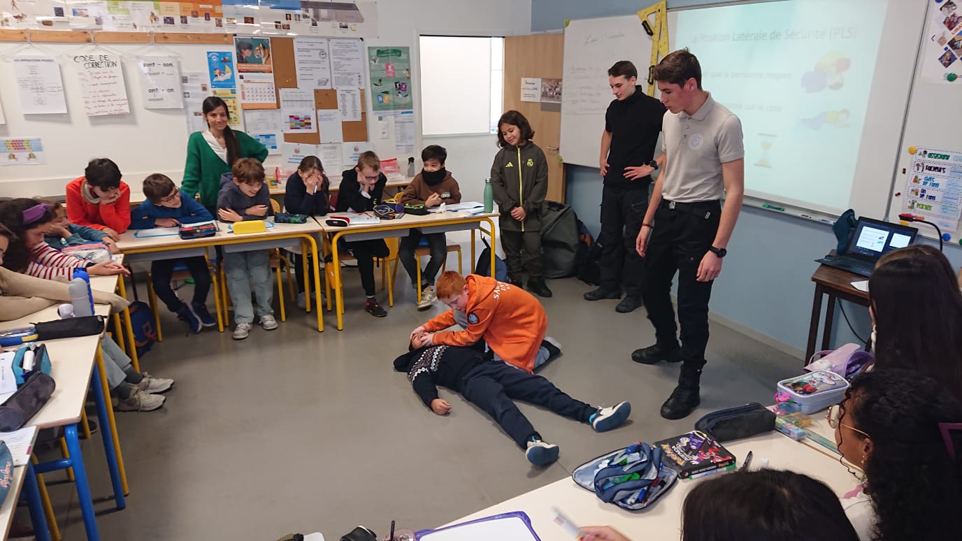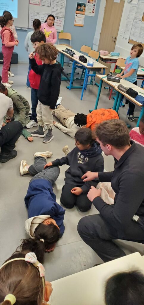 Des lycéens de la filière sécurité du LP Sainte Thérèse sont venus ce lundi 24 novembre matin dans les classes de CM pour une intervention sur les gestes qui sauvent. Après un rappel théorique sur les numéros d’urgence, comment Protéger, Alerter et Secourir, les élèves ont pu s’entraîner à mettre un corps en PLS. Ils étaient aussi très fiers de s’entraîner ensuite sur un mannequin pour le massage cardiaque. Pas évident d’appuyer si fort et pendant si longtemps !