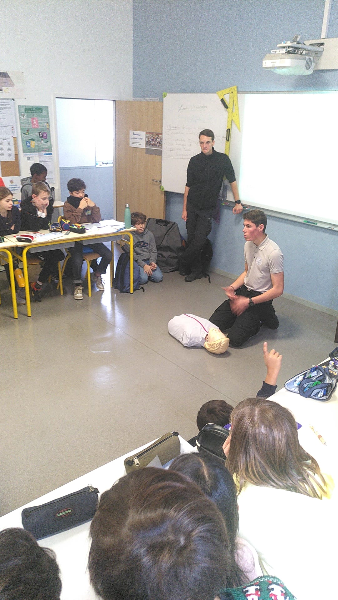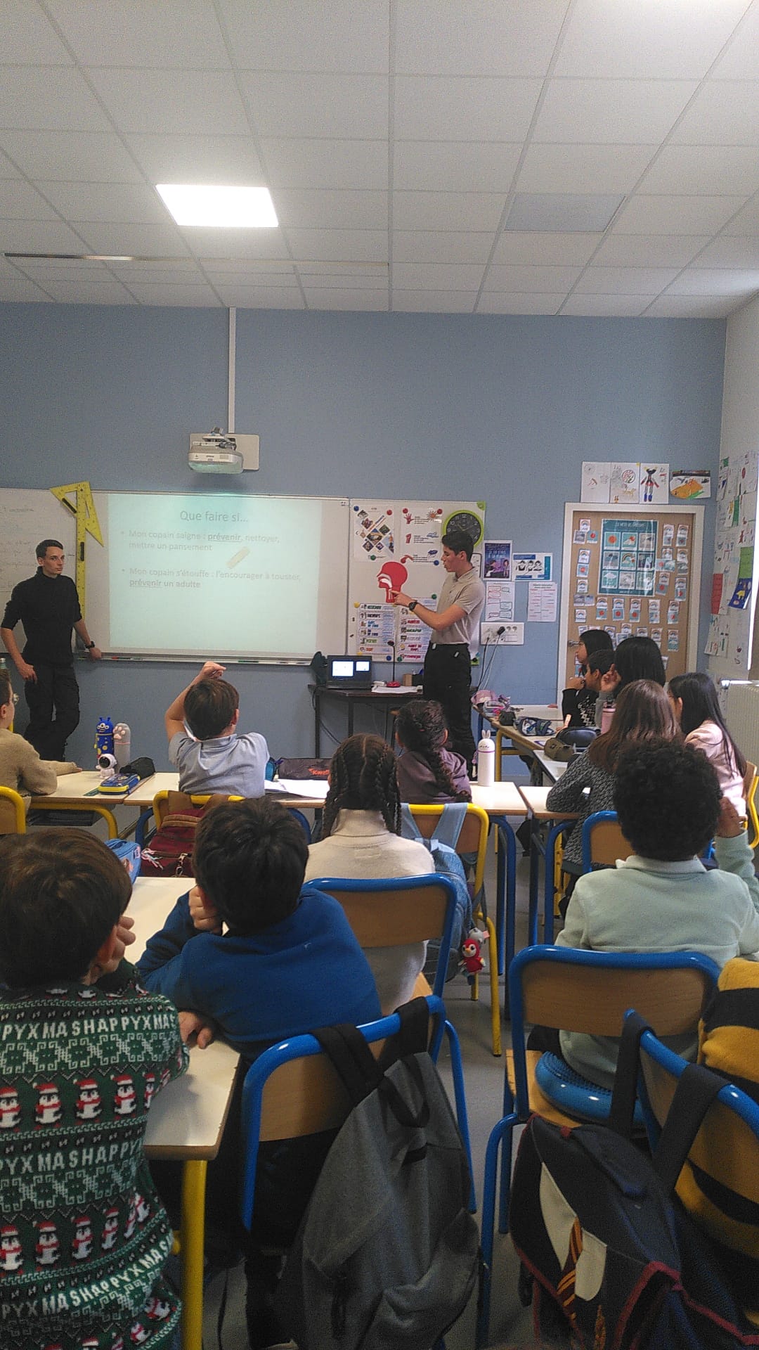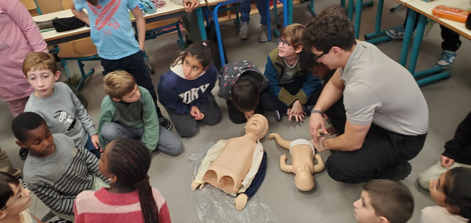 Des lycéens de la filière sécurité du LP Sainte Thérèse sont venus ce lundi 24 novembre matin dans les classes de CM pour une intervention sur les gestes qui sauvent. Après un rappel théorique sur les numéros d’urgence, comment Protéger, Alerter et Secourir, les élèves ont pu s’entraîner à mettre un corps en PLS. Ils étaient aussi très fiers de s’entraîner ensuite sur un mannequin pour le massage cardiaque. Pas évident d’appuyer si fort et pendant si longtemps !